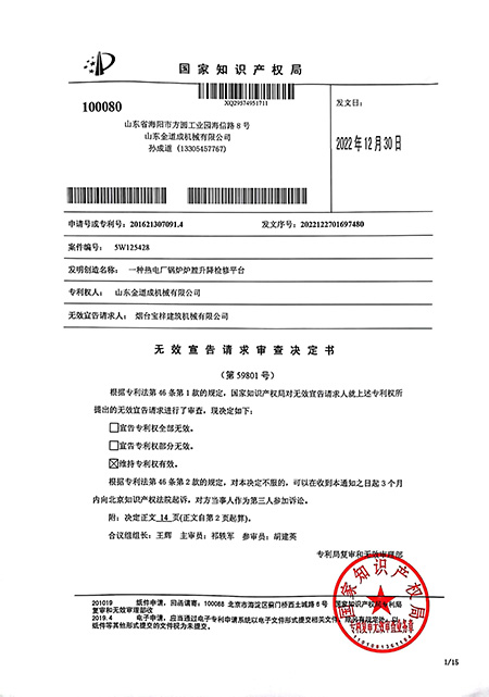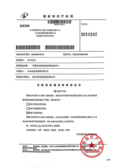 煙臺(tái)寶梓建筑機(jī)械有限公司抄襲的專利(專利號(hào):201820409444.4),于2021年02月01日被國(guó)家知識(shí)產(chǎn)權(quán)局專利復(fù)審委員會(huì)宣告專利權(quán)全部無(wú)效。該公司惡意提起無(wú)效山東金道成機(jī)械有限公司有關(guān)專利的申請(qǐng),經(jīng)過(guò)國(guó)家知識(shí)產(chǎn)權(quán)局專利復(fù)審委員會(huì)的有關(guān)審查程序,根據(jù)《專利法》第46條第1款的規(guī)定,于2022年12月30日對(duì)我公司兩項(xiàng)專利做出宣告專利權(quán)全部有效的審查決定。